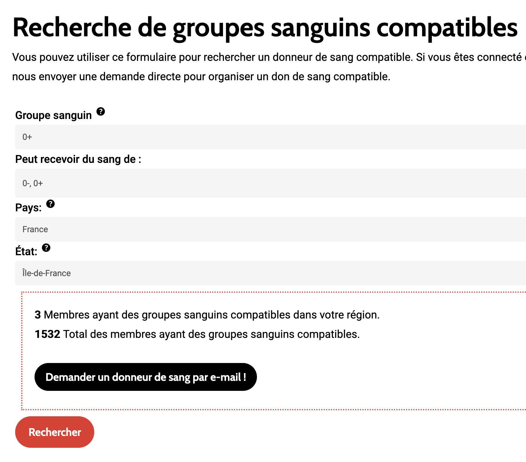 Vous trouverez 3 donneurs potentiels dans votre région. Vous cliquez sur le bouton noir “demande de don de sang par courriel” et remplissez le formulaire de contact qui suit. Vous y indiquez vos coordonnées, par exemple le degré d’urgence de votre demande, si votre hôpital a déjà accepté d’accueillir votre donneur de sang, et vous soumettez d’autres informations.