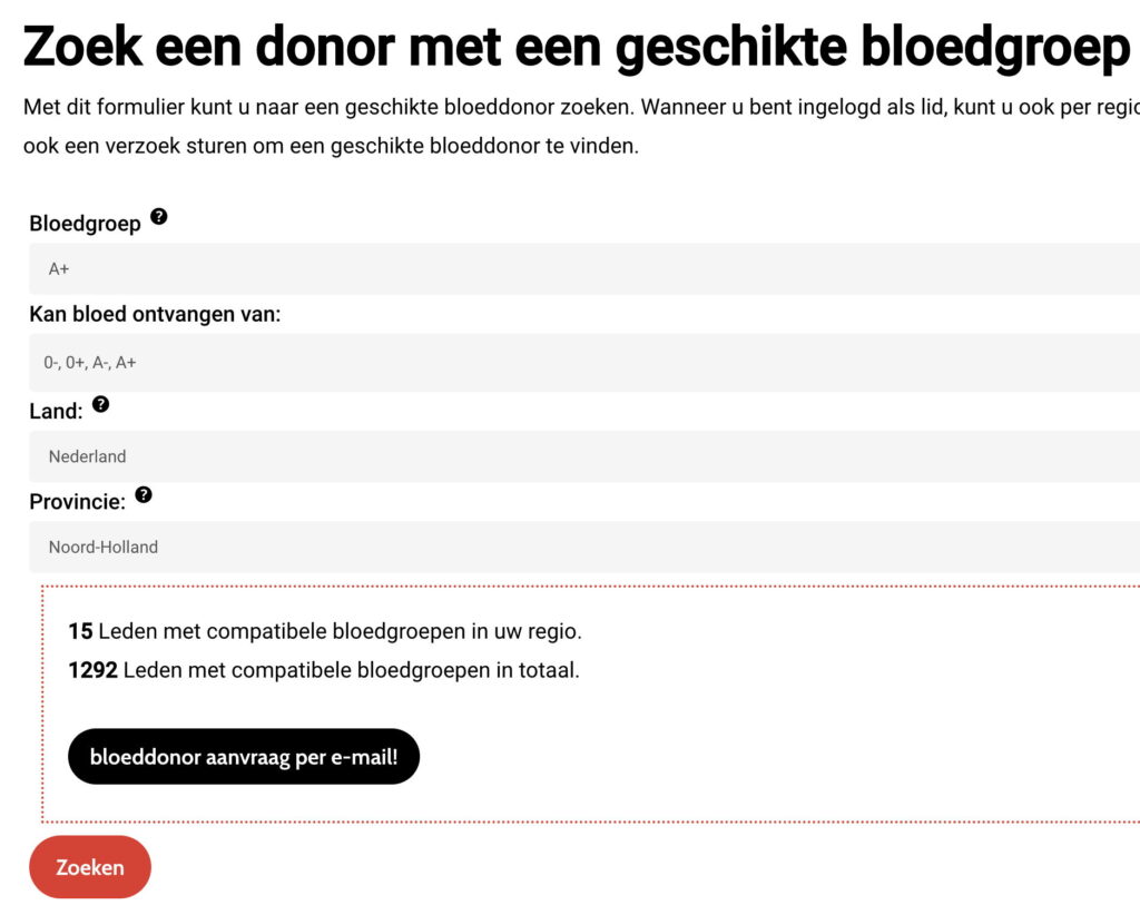 Heel belangrijk : vul a.u.b. de gegevens in die we nodig hebben . Het is absoluut nutteloos als u lid wordt maar ons niet uw bloedgroep vertelt of hoe en waar u te bereiken bent. U komt terecht in een (volledig anonieme) database waar wij en u naar potentiële bloeddonoren kunnen zoeken – als daar geen informatie in staat, werkt het allemaal niet. Als u echter uw bloedgroep op dit moment niet weet, geen probleem, u kunt nu lid worden en deze later toevoegen.