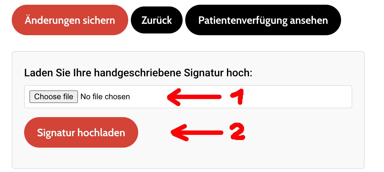 Nachdem Sie Ihre Änderungen gesichert haben, können Sie noch eine eingescannte Unterschrift hochladen. Wählen Sie dazu das File aus, welches Ihre Unterschrift enthält (1, Choose file) und drücken Sie dann auf “Signatur hochladen (2)”. Nachdem Sie die Nachricht “Signatur erfolgreich hochgeladen” sehen, ist Ihre Patientenverfügung aktuell.